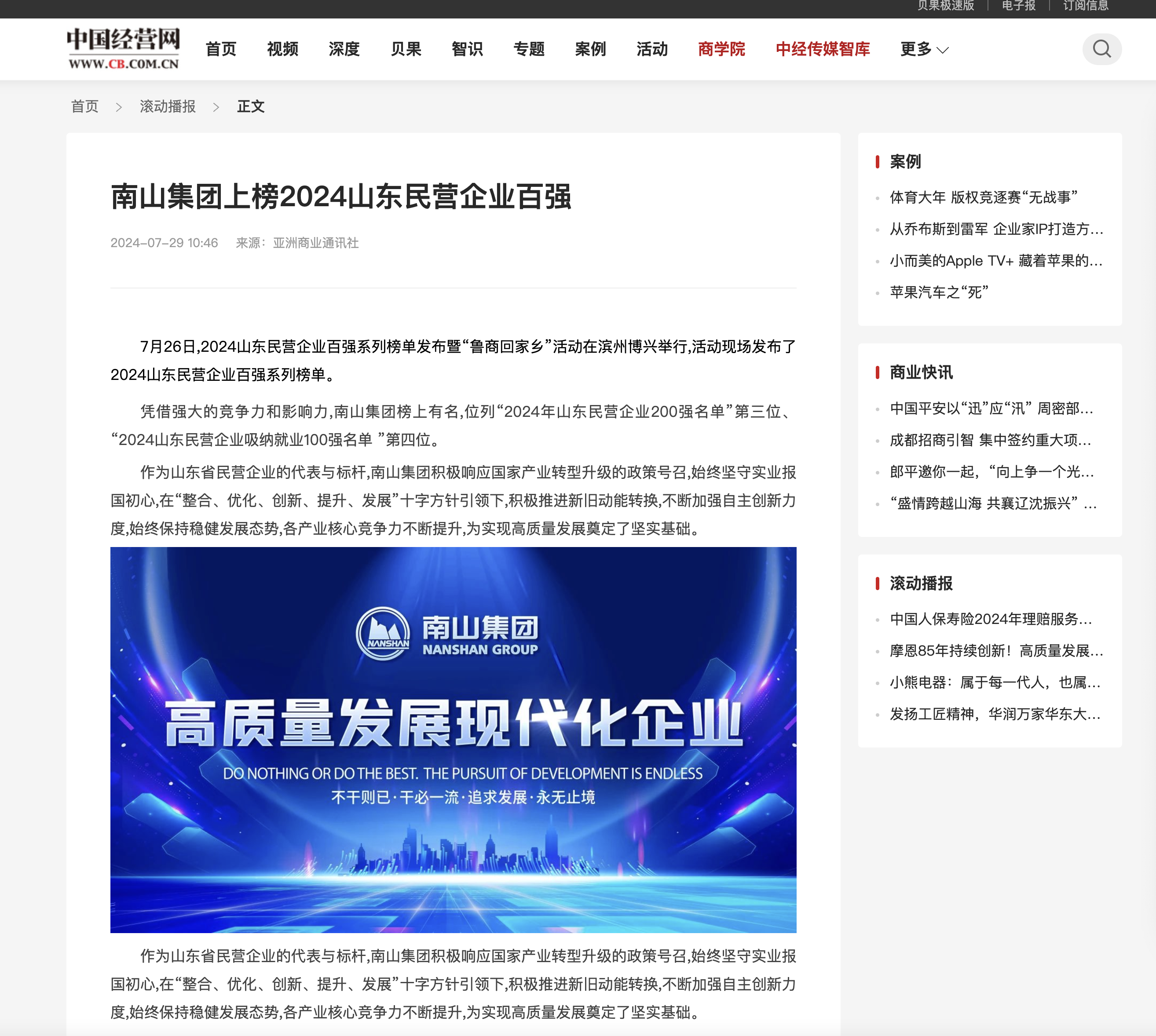 中國(guó)經(jīng)營(yíng)網(wǎng):南山集團(tuán)上榜2024山東民營(yíng)企業(yè)百?gòu)?qiáng)