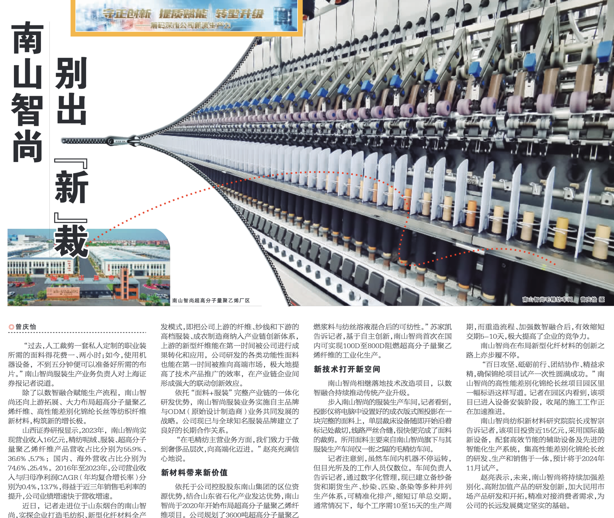 近日,記者走進(jìn)位于山東煙臺(tái)的南山智尚,實(shí)探企業(yè)打造毛紡織、新型化纖材料全產(chǎn)業(yè)鏈協(xié)同發(fā)展格局、積極尋求轉(zhuǎn)型升級(jí)的創(chuàng)新密碼。