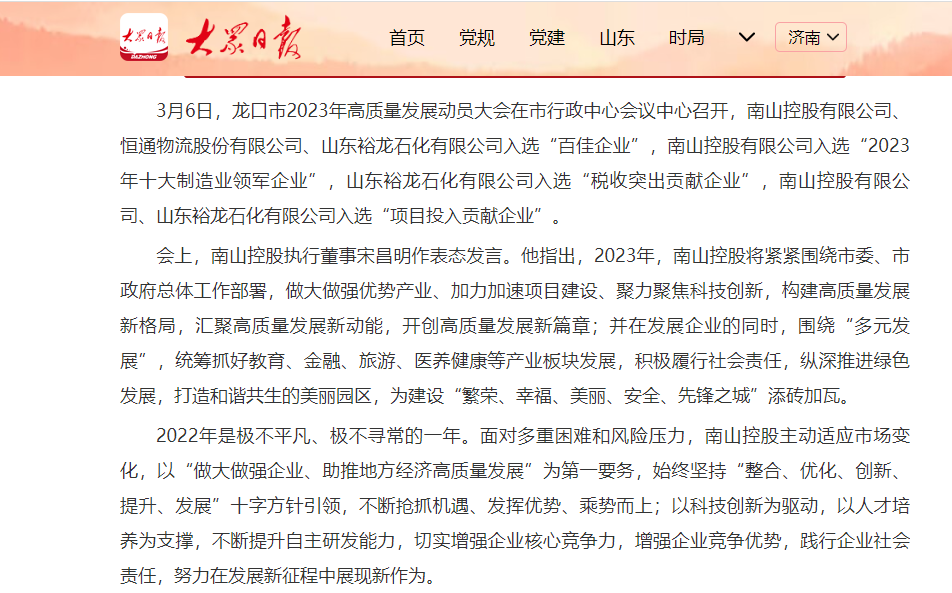 3月6日,龍口市2023年高質(zhì)量發(fā)展動(dòng)員大會(huì)在市行政中心會(huì)議中心召開,南山控股有限公司、恒通物流股份有限公司、山東裕龍石化有限公司入選“百佳企業(yè)”,南山控股有限公司入選“2023年十大制造業(yè)領(lǐng)軍企業(yè)”,山東裕龍石化有限公司入選“稅收突出貢獻(xiàn)企業(yè)”,南山控股有限公司、山東裕龍石化有限公司入選“項(xiàng)目投入貢獻(xiàn)企業(yè)”。