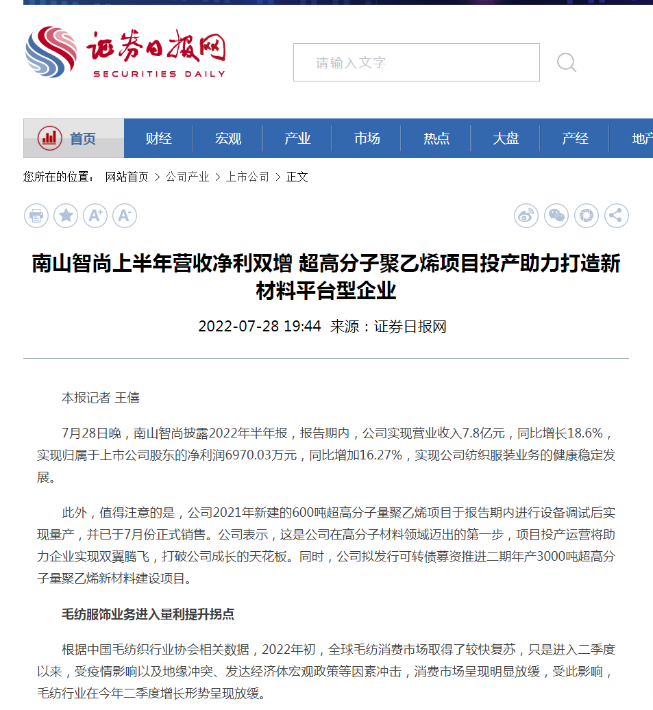 南山智尚著力打造“雙鏈協(xié)同”發(fā)展體系,是全球為數(shù)不多的毛紡織服裝產(chǎn)業(yè)鏈一體化公司,擁有從羊毛到成衣完整的毛紡織服飾產(chǎn)業(yè)鏈。同時,建設3600噸超高分子量聚乙烯產(chǎn)業(yè)園區(qū)。使雙鏈驅動的南山智尚具有持續(xù)效益增長的超強壁壘優(yōu)勢,主營業(yè)務涵蓋精紡呢絨、服裝、超高分子量聚乙烯相關產(chǎn)品的研發(fā)、設計、生產(chǎn)與銷售。