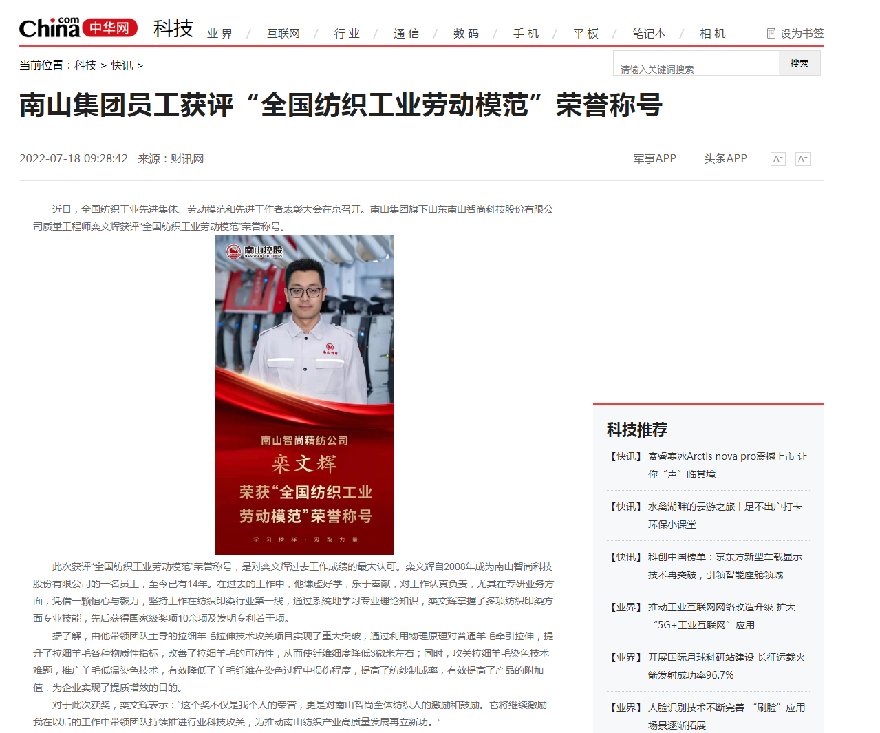 中華網(wǎng):南山集團(tuán)員工獲評(píng)“全國(guó)紡織工業(yè)勞動(dòng)模范”榮譽(yù)稱號(hào)