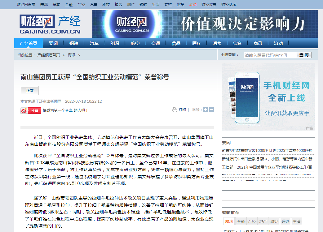 財(cái)經(jīng)網(wǎng):南山集團(tuán)員工獲評(píng)“全國(guó)紡織工業(yè)勞動(dòng)模范”榮譽(yù)稱號(hào)