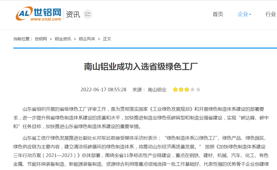 南山鋁業(yè)成功入選省級綠色工廠-世鋁網(wǎng)