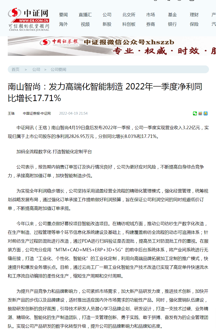 南山智尚:發(fā)力高端化智能制造 2022年一季度凈利同比增長17.71% -中證網(wǎng)