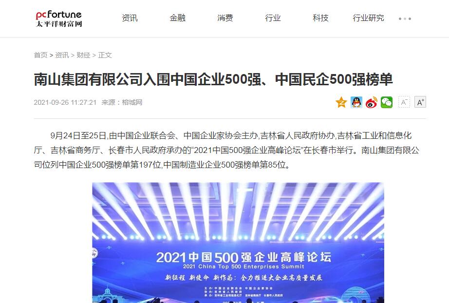 9月24日至25日,由中國企業(yè)聯(lián)合會、中國企業(yè)家協(xié)會主辦,吉林省人民政府協(xié)辦,吉林省工業(yè)和信息化廳、吉林省商務(wù)廳、長春市人民政府承辦的“2021中國500強企業(yè)高峰論壇”在長春市舉行。南山集團(tuán)有限公司位列中國企業(yè)500強榜單第197位,中國制造業(yè)企業(yè)500強榜單第85位。