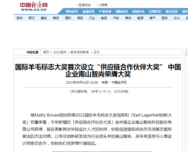 國(guó)際羊毛標(biāo)志大獎(jiǎng)首次設(shè)立“供應(yīng)鏈合作伙伴大獎(jiǎng)” 中國(guó)企業(yè)南山智尚榮膺大獎(jiǎng)-中國(guó)經(jīng)濟(jì)網(wǎng)
