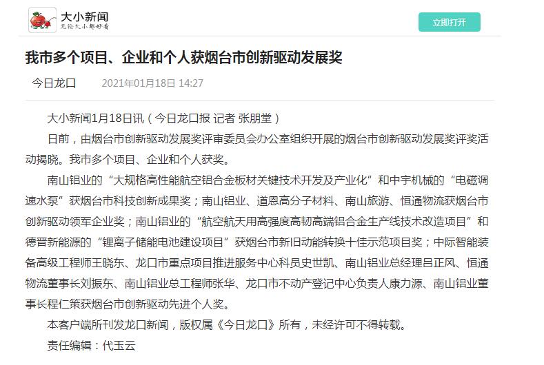 南山鋁業(yè)的“大規(guī)格高性能航空鋁合金板材關鍵技術開發(fā)及產(chǎn)業(yè)化”和中宇機械的“電磁調(diào)速水泵”獲煙臺市科技創(chuàng)新成果獎;南山鋁業(yè)、道恩高分子材料、南山旅游、恒通物流獲煙臺市創(chuàng)新驅動領軍企業(yè)獎;南山鋁業(yè)的“航空航天用高強度高韌高端鋁合金生產(chǎn)線技術改造項目”和德晉新能源的“鋰離子儲能電池建設項目”獲煙臺市新舊動能轉換十佳示范項目獎;中際智能裝備高級工程師王曉東、龍口市重點項目推進服務中心科員史世凱、南山鋁業(yè)總經(jīng)理呂正風、恒通物流董事長劉振東、南山鋁業(yè)總工程師張華、龍口市不動產(chǎn)登記中心負責人康力源、南山鋁業(yè)董事長程仁策獲煙臺市創(chuàng)新驅動先進個人獎。