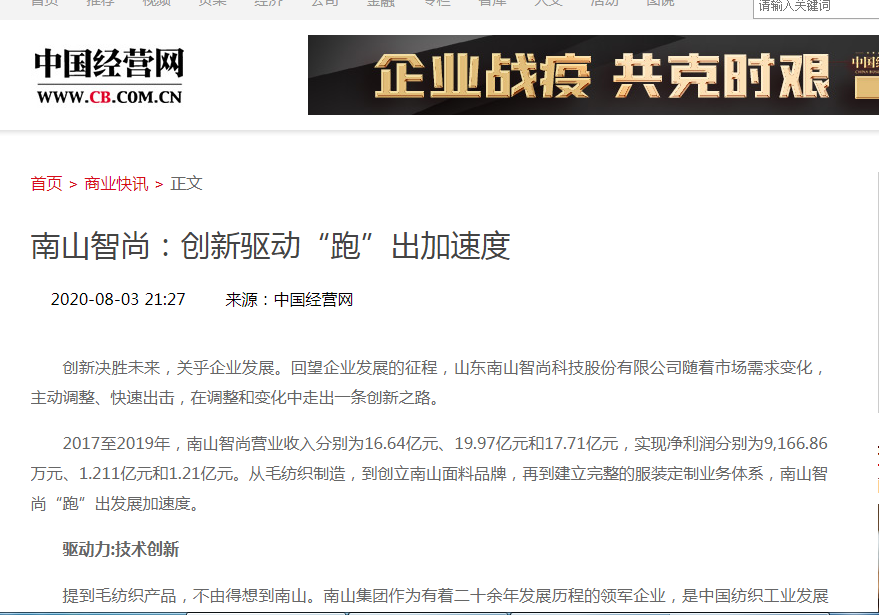 創(chuàng)新決勝未來,關(guān)乎企業(yè)發(fā)展?;赝髽I(yè)發(fā)展的征程,山東南山智尚科技股份有限公司隨著市場需求變化,主動調(diào)整、快速出擊,在調(diào)整和變化中走出一條創(chuàng)新之路。 2017至2019年,南山智尚營業(yè)收入分別為16.64億元、19.97億元和17.71億元,實(shí)現(xiàn)凈利潤分別為9,166.86萬元、1.211億元和1.21億元。從毛紡織制造,到創(chuàng)立南山面料品牌,再到建立完整的服裝定制業(yè)務(wù)體系,南山智尚“跑”出發(fā)展加速度。