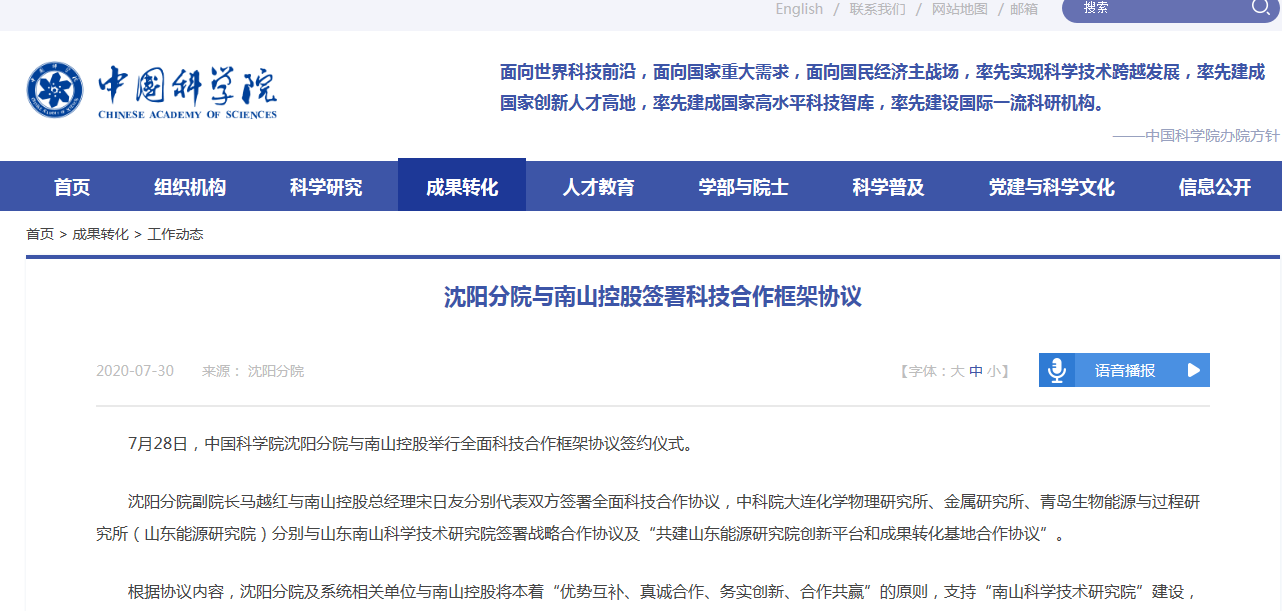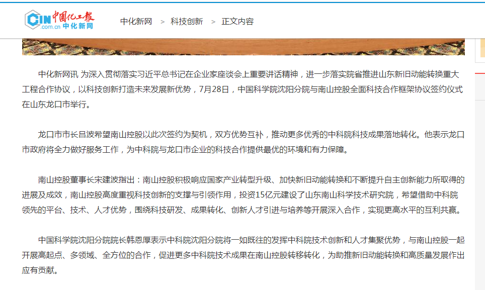 中國科學(xué)院沈陽分院與南山控股簽署全面科技合作框架協(xié)議 -中化新網(wǎng)