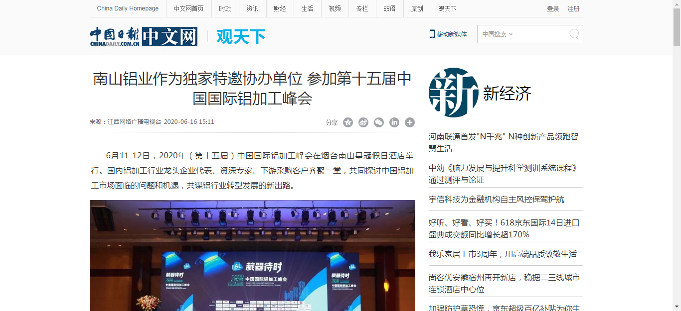 【中國(guó)日?qǐng)?bào)】南山鋁業(yè)作為獨(dú)家特邀協(xié)辦單位 參加第十五屆中國(guó)國(guó)際鋁加工峰會(huì)