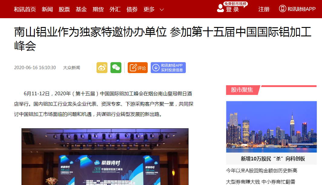 【和訊網(wǎng)】南山鋁業(yè)作為獨(dú)家特邀協(xié)辦單位 參加第十五屆中國(guó)國(guó)際鋁加工峰會(huì)