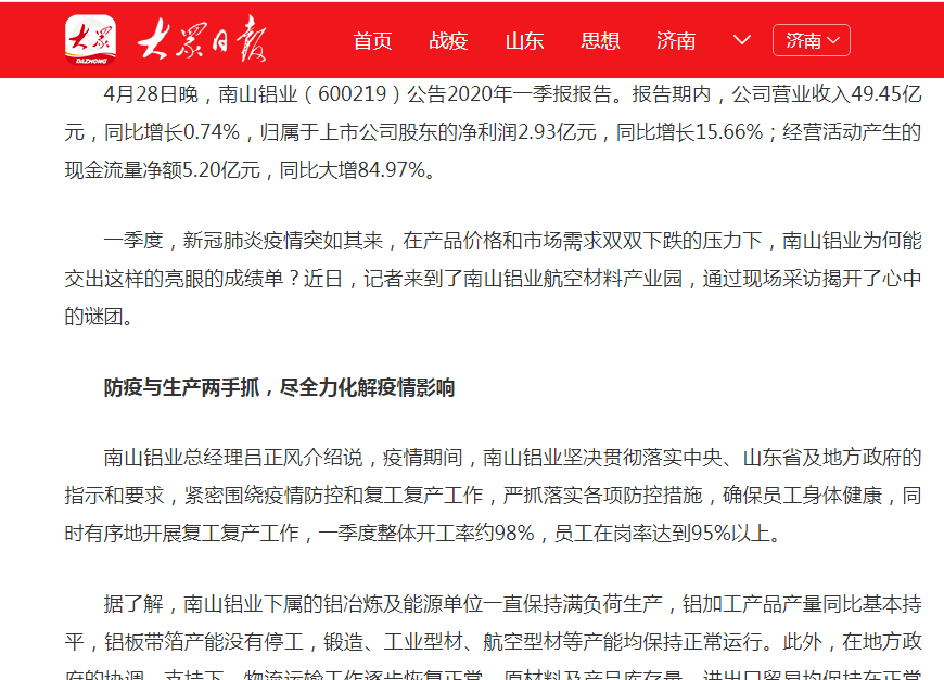 山東權(quán)威媒體大眾日報專題采訪報道南山鋁業(yè):深化創(chuàng)新驅(qū)動、轉(zhuǎn)型高端制造,面對疫情不利影響仍交出亮眼成績。