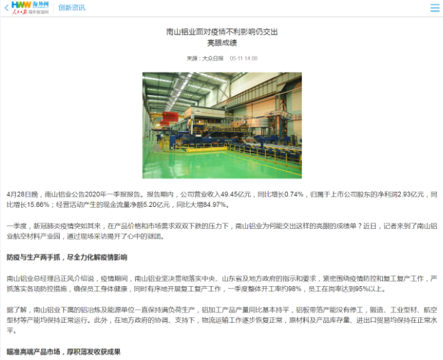 南山鋁業(yè)面對疫情不利影響仍交出亮眼成績-人民日報