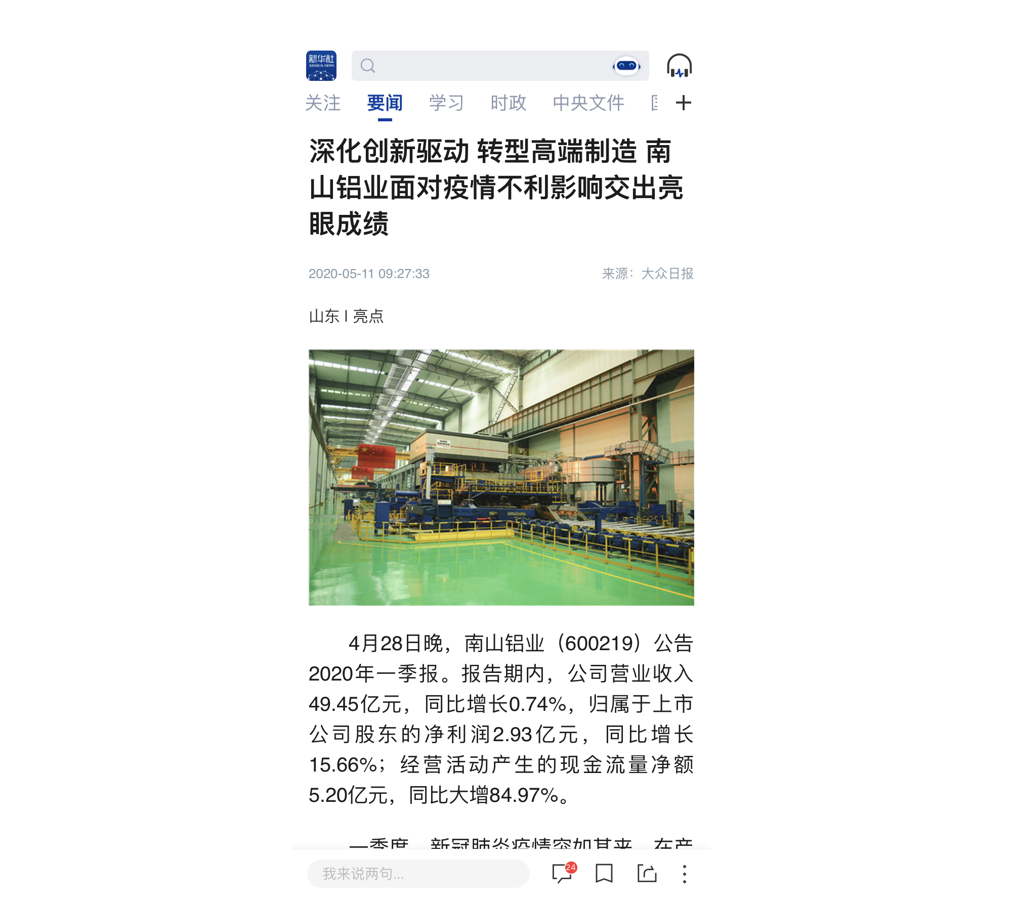 新華社轉(zhuǎn)載大眾日報專題采訪報道南山鋁業(yè):深化創(chuàng)新驅(qū)動、轉(zhuǎn)型高端制造,面對疫情不利影響仍交出亮眼成績。