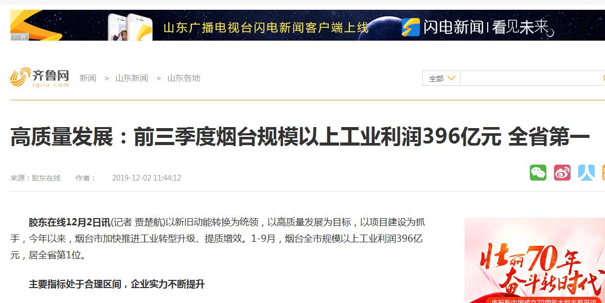 高質(zhì)量發(fā)展:前三季度煙臺規(guī)模以上工業(yè)利潤396億元 全省第一-齊魯網(wǎng)