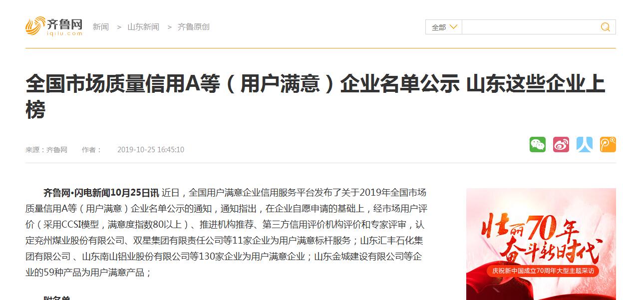 全國市場質(zhì)量信用A等(用戶滿意)企業(yè)名單公示 山東這些企業(yè)上榜-齊魯網(wǎng)