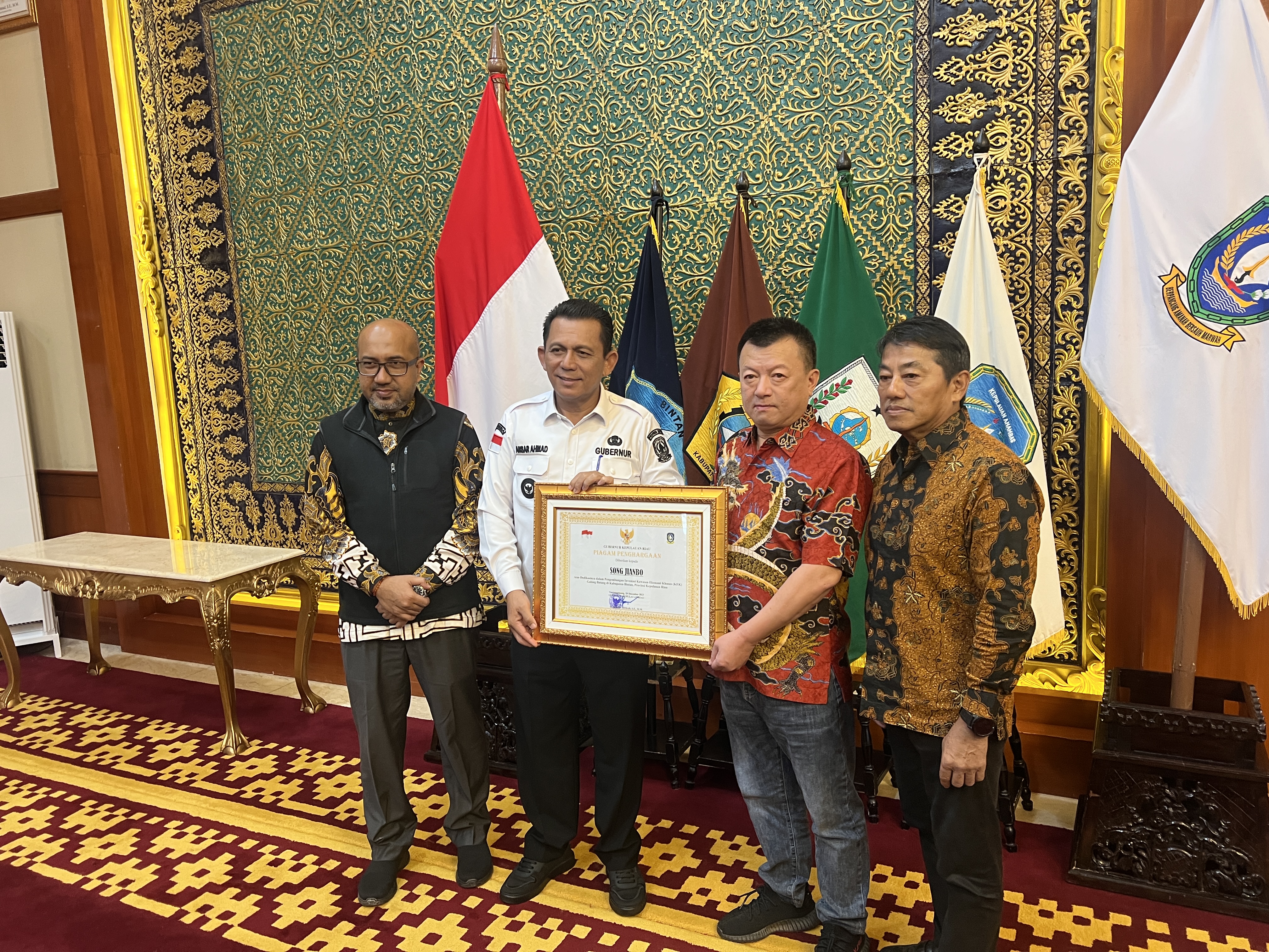 為表彰南山控股董事長(zhǎng)宋建波先生對(duì)印尼廖內(nèi)群島省建設(shè)發(fā)展做出的卓越貢獻(xiàn),2023年12月28日,廖內(nèi)群島省省長(zhǎng)安薩爾·艾哈邁德(Ansar Ahmad)在廖內(nèi)群島省政府為宋建波董事長(zhǎng)頒發(fā)了“廖內(nèi)群島省投資與發(fā)展卓越貢獻(xiàn)獎(jiǎng)”。