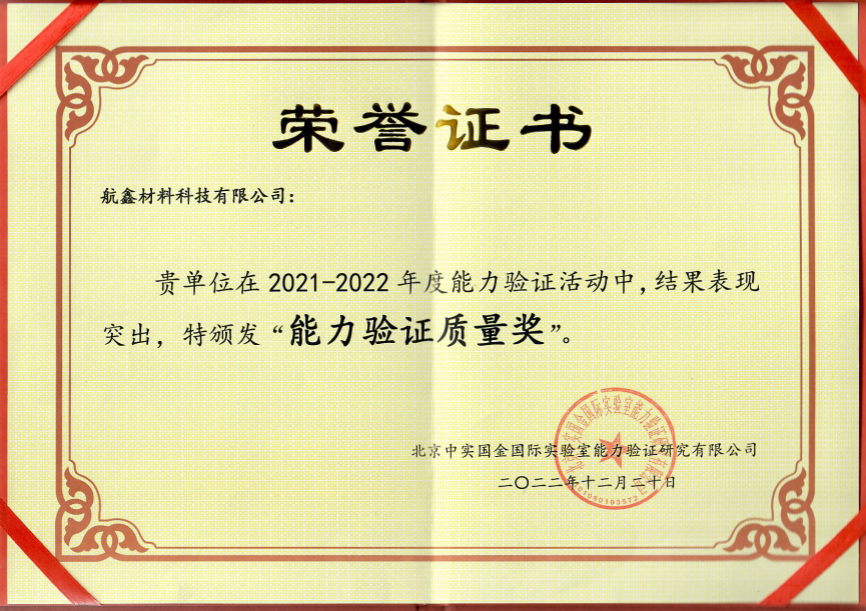 近日,航鑫材料科技有限公司(檢測中心)在北京中實國金舉辦的2021—2022年度實驗檢測能力驗證評選活動中,憑借優(yōu)異的表現(xiàn),榮獲“能力驗證質量獎”。
