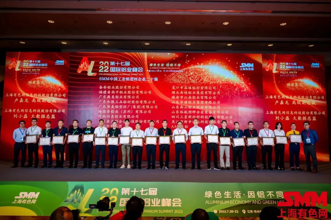 7月20日-22日,2022年SMM(第十七屆)國際鋁業(yè)峰會在江蘇蘇州舉行。山東南山鋁業(yè)股份有限公司旗下鋁材公司和板帶事業(yè)部分別獲得“中國工業(yè)鋁型材企業(yè)二十強”和“中國鋁板帶箔企業(yè)二十強”榮譽稱號。